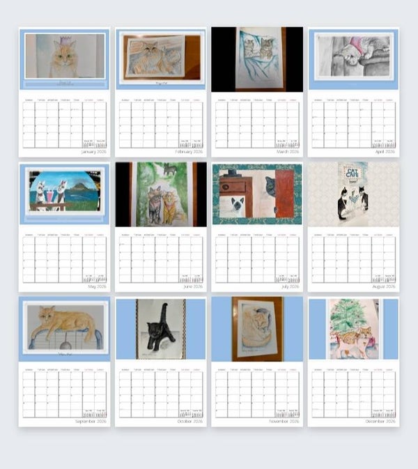 A variety of prints in calendar form for 2026 from the many quirky illustrations I have created of crazy cats.